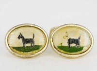 Faces oblongues à miniatures de chiens coloriés à la main, en sulfure (inclusion sous verre) vintage. Métal blanc très léger à reflets dorés. Poids 7,2 g et taille 21x16,5 mm.