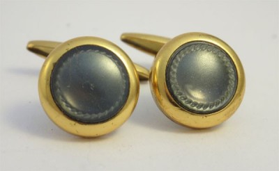 Boutons de manchette en métal dorés d'époque 1930 avec faces en nacre grise. Poids 4,5 g et diamètre 14 mm.
