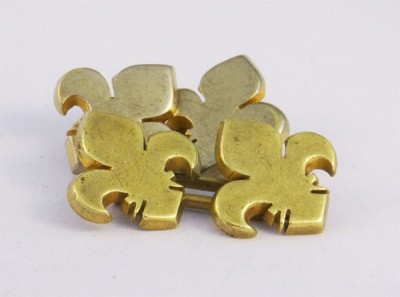 Boutons de manchette quatres faces représentant chacune une fleur de lys stylisée. Au dos, la signature "Guiso" , et la mention "Déposé". Le métal est légèrement doré, et l'un des boutons est moins doré que l'autre. Epoque vers 1930. Poids 5,6 g et taille 13,9x13,7 mm.
