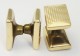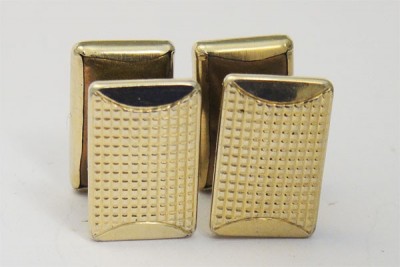 Boutons de manchette en plaqué or. Les quatre faces sont finement guillochées, et reliées par des chainettes rétractables. Poids 4,2 g et dimensions 15 x 9,5 mm.