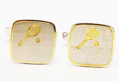 Boutons aux faces à raquette et balles de tennis, d'époque vintage vers 1950. Métal blanc et doré. Poinçons de maître "SO".