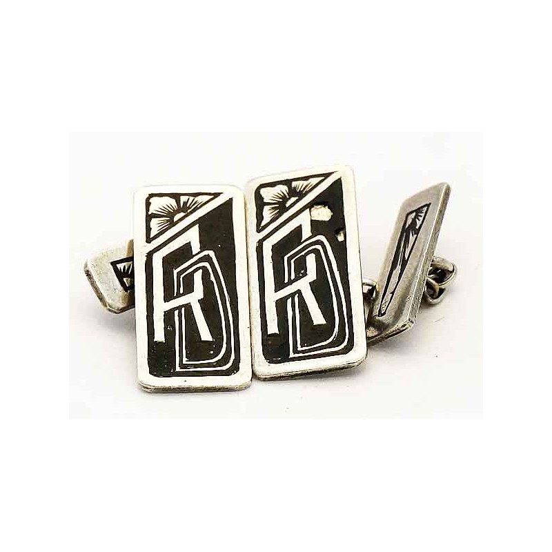 Beaux boutons de manchettes d'époque 1900 Art Nouveau en argent, avec les initiales "RD". Un petit manque dans le noir sur une des faces.